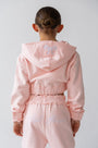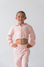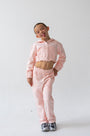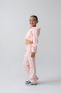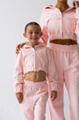 Maximum style, minimum effort. Update your sweats this season with our most popular oversized kids tracksuit. Our joggers feature a straight leg design with a raw hem, distressed waist band and our embroidered logo on the back. Our crop hoodie is designed to flatter with our ruched waist band and cuffs. The large hood with bow embroidered detailing and zip is a must for those perfect hair days! These tracksuits are an everyday must from lazy days to running your daily errands!